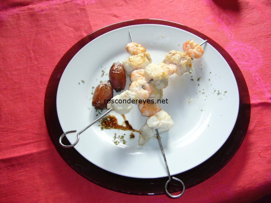 Se corta la cola del rape en trozos del mismo o parecido tamaño, se pelan los langostinos y se montan las brochetas (tres trozos de rape y tres langostinos por brocheta es una buena proporción). Añadimos una pizca de sal y pimienta blanca.