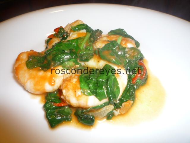 Dar la vuelva en cuanto la carne de los langostinos se vuelva sonrosada (quedando casi crudos por dentro). Una vez dados la vuelta, retirarlos de la sartén. Introducir las espinacas lavadas y centrifugadas y tapar. En un par de minutos las espinacas habrán soltado un poco de agua y se habrán reducido a la mitad. Añadir las dos cucharadas de salsa de tomate y mezclar con las espinacas. Por último introducir nuevamente los langostinos, tapar y apagar el fuego. Con el calor residual estarán en su punto en un minuto.